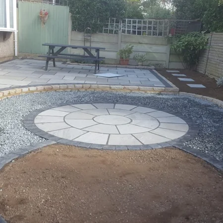 All the old hard landscaping was removed, the ground prepared and brickwork cemented to define a central flower bed, followed by the laying of sand and membrane, finishing off with a deep layer of stone chippings. All the work was carried out efficiently by the team and the debris taken away immediately between each stage of the work. All Seasons and Landscapes & Drives had understood exactly what we required and we are delighted with the finished work. Finally the site was cleaned and left tidy. Thank you All Seasons Landscapes & Drive Ltd.